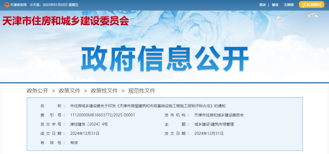 《天津市房屋建筑和市政基础设施工程施工招标评标办法》津住建发〔2024〕4号发布!2025年4月1日起施行!