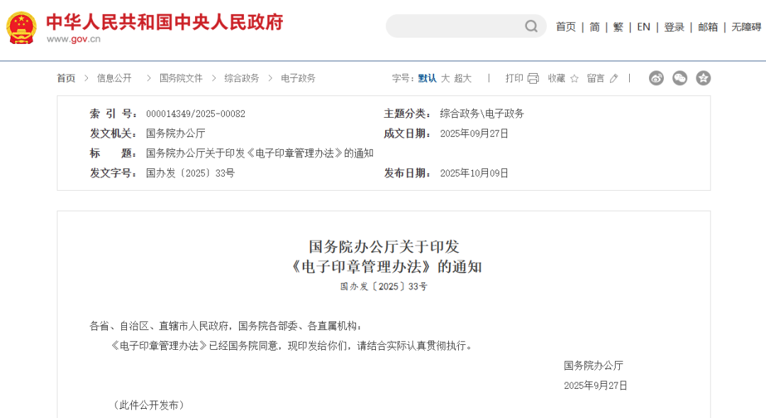 国务院办公厅关于印发《电子印章管理办法》的通知 国办发〔2025〕33号![]() 第一章 总则 第一条 为了加强电子印章规范管理,推动电子印章普遍应用,服务政务活动和经济社会数字化发展,根据《中华人民共和国电子签名法》、《中华人民共和国密码法》、《中华人民共和国网络安全法》、《中华人民共和国数据安全法》以及印章管理有关法律法规,制定本办法。 第二条 本办法所称电子印章,是指基于密码技术和相关数字技术表征印章的特定格式数据,用于实现电子文件的可靠电子签名。 电子印章包含印章图像数据、印章名称、印章所有者信息、电子签名认证证书以及与其关联的电子签名制作数据等。 第三条 本办法适用于行政机关、企业事业单位、社会组织以及其他依法成立的组织〔以下统称单位(组织)〕的法定名称章,以法定名称冠名的内设机构章、分支机构章、业务专用章,以及用于单位(组织)事务办理的个人名章等电子印章的管理和应用活动。 第四条 电子印章管理工作遵循统筹推进、分级管理、规范标准、安全可控的原则。 第五条 符合本办法规定的电子印章与实物印章具有同等法律效力。除法律、行政法规明确不适用的情形外,经电子签章的电子文件与加盖实物印章的纸质文件具有同等效力。 第二章 管理和服务主体 第六条 国家密码管理局负责电子印章有关密码管理工作,对电子印章相关的电子政务电子认证服务实施监督管理,推动电子印章标准化工作,促进电子印章在政务活动中的互信互认。 国家密码管理局会同有关部门统筹协调和推进全国电子印章的规范管理和推广应用。 第七条 国务院办公厅负责依托全国一体化政务服务平台推动政务服务、公共服务以及相关社会化服务领域电子印章的互信互认。 第八条 工业和信息化部负责对电子印章相关的电子认证服务实施监督管理。 第九条 公安机关负责依法打击涉及电子印章的违法犯罪行为。 第十条 省、自治区、直辖市密码管理部门负责本行政区域内电子印章有关密码管理工作,对电子印章相关的电子政务电子认证服务实施监督管理,推动电子印章标准化工作,促进电子印章在政务活动中的互信互认。 第十一条 各地区各部门应当统筹加强本地区本部门(本系统)电子印章的规范管理和推广应用,促进电子印章互信互认。 (一)各省(自治区、直辖市)、国务院各部门应当参照印章管理有关法律法规明确电子印章制发部门,负责本地区本部门(本系统)电子印章申请和注销的管理。 (二)各省(自治区、直辖市)应当明确电子印章制作管理单位,负责本地区电子印章的制作、备案等工作。国务院各部门根据职责范围和实际需要明确电子印章制作管理单位,负责本部门(本系统)电子印章的制作、备案等工作。 第十二条 电子印章涉及的电子政务电子认证服务,应当由依法设立的电子政务电子认证服务机构提供。电子印章涉及的电子认证服务,应当由依法设立的电子认证服务机构提供。 第三章 制作、备案与注销管理 第十三条 电子印章制发部门应当参照印章管理有关法律法规,明确申请电子印章的程序和要求。 企业、社会组织等申请电子印章的程序可以结合实际适当简化。 第十四条 电子印章制作管理单位应当明确电子印章制作程序、材料等具体要求。单位(组织)应当按照要求提交真实、合法、有效的制作材料,由电子印章制作管理单位进行核查。 相关材料应当包含: (一)电子印章申请通过的相关证明材料; (二)单位(组织)的设立批准文件或者设立登记证件; (三)制作电子印章的相关数据和信息; (四)电子印章制作管理单位规定提交的其他材料。 鼓励电子印章制作管理单位优先通过数据共享方式获取上述相关材料。 第十五条 鼓励和支持电子印章制作系统与提供电子签章、电子签章验证等功能的信息系统独立部署。电子印章制作系统存在条块交叉的,应当统筹协调、集约建设。 第十六条 电子印章制作应当符合以下要求: (一)电子印章的电子签名认证证书应当合法有效,由依法设立的电子政务电子认证服务机构或者电子认证服务机构签发,电子印章有效期的截止时间不超过电子印章所有者电子签名认证证书有效期的截止时间; (二)电子印章的数据格式、生成流程和应用接口应当符合国家有关标准规范; (三)电子印章的图像规格、式样等图像数据应当与印章管理有关法律法规明确的印模规制保持一致,可以根据需要附加电子印章相关标注字样。无对应实物印章的,电子印章图像数据可以参照相近实物印章的印模规制。 第十七条 电子印章制作完成后,电子印章相关信息应当由电子印章制作管理单位进行备案。发生电子印章停用、恢复等状态变更情形的,电子印章所有者或者相关单位应当及时向电子印章制作管理单位进行备案。 电子印章制作管理单位应当提供电子印章状态信息查询服务。 第十八条 因电子印章有效期到期、电子印章载体损坏或者遗失、电子签名制作数据失密等情形需要重新制作电子印章的,电子印章所有者应当向电子印章制作管理单位提出重新制作。重新制作流程可以结合实际适当简化。 第十九条 电子印章所有者发生更名、解散、撤销、被吊销、破产、分立、合并等情形,应当注销电子印章。电子印章所有者应当按照要求及时向电子印章制发部门提出注销