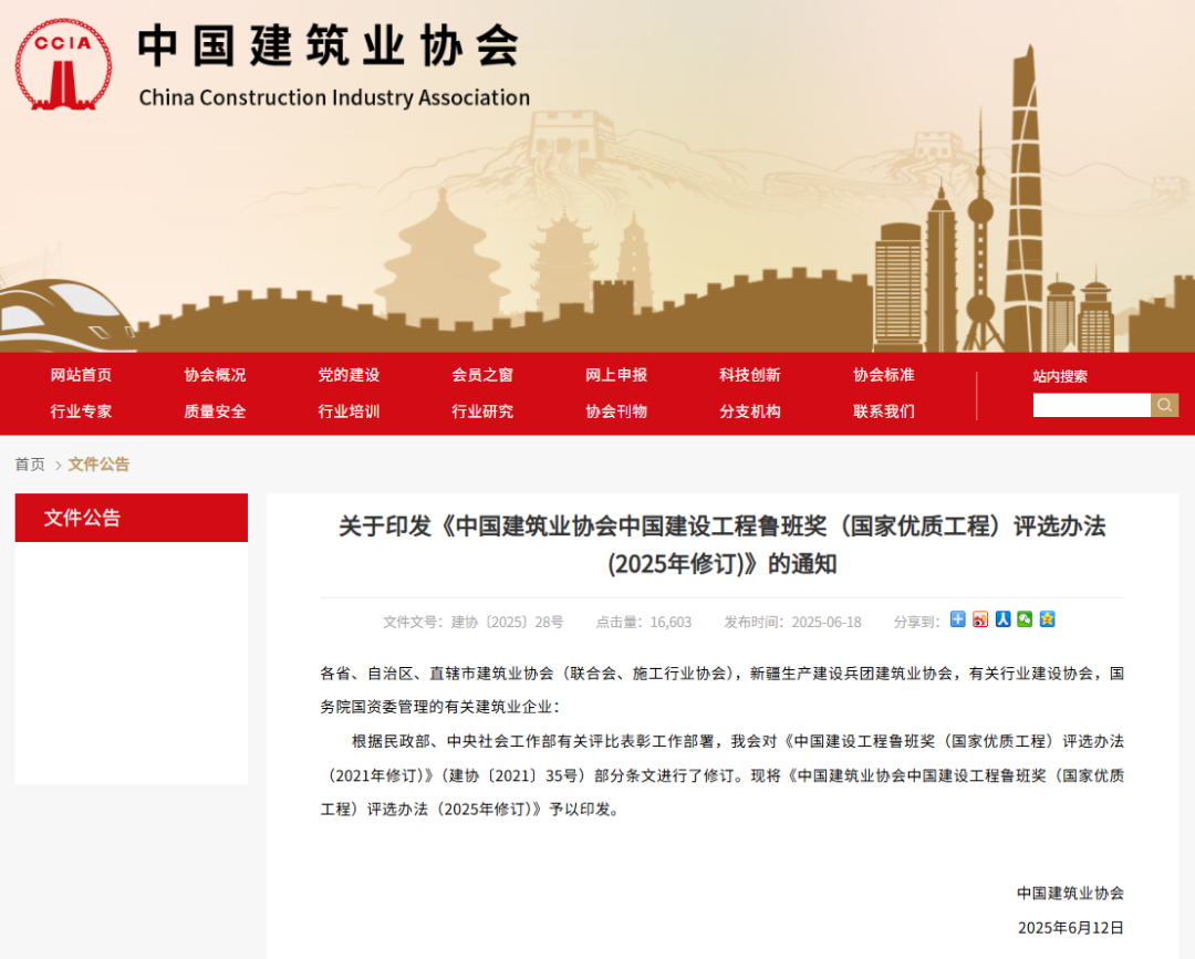 关于印发《中国建筑业协会中国建设工程鲁班奖(国家优质工程)评选办法(2025年修订)》的通知通知原文 / NEW 关于印发《中国建筑业协会中国建设工程鲁班奖(国家优质工程)评选办法(2025年修订)》的通知文件文号:建协〔2025〕28号 发布时间:2025-06-18 各省、自治区、直辖市建筑业协会(联合会、施工行业协会),新疆生产建设兵团建筑业协会,有关行业建设协会,国务院国资委管理的有关建筑业企业: